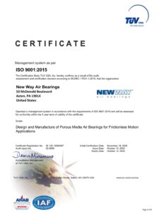 On September 2, 2018, New Way® Air Bearings, the world’s largest independent manufacturer of porous media air bearing products, achieved ISO 9001:2015 certification, the latest ISO standard designation. New Way received its certificate from the same independent auditing firm that evaluated New Way when it achieved its original ISO 9001:2000 Certification back in November, 2008. This further demonstrates the organization’s commitment to quality-of-service standards established by the International Organization for Standardization (ISO).