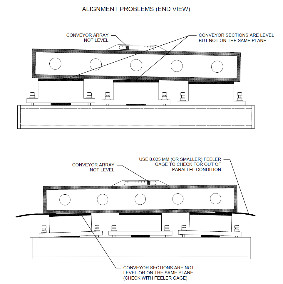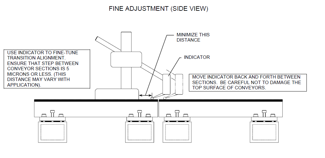 Begin by installing the conveyor sections, and adjust the gap between the adjustment feet and support structure to a nominal gap of 0.40mm. This will place the conveyor in the middle of the 0.80mm range of the adjustment feet. At this time, measure the flatness and height of the conveyor sections, and their alignment to other critical equipment, as is necessary. If necessary, modify positions of the support structure. Once support structure positioning is satisfactory, adjust all conveyor sections to be level and coplanar. Use the hold down and jack up adjustment screws, master flat, level, and a 0.025mm feeler gauge to bring the rough adjustment as close as possible to level.