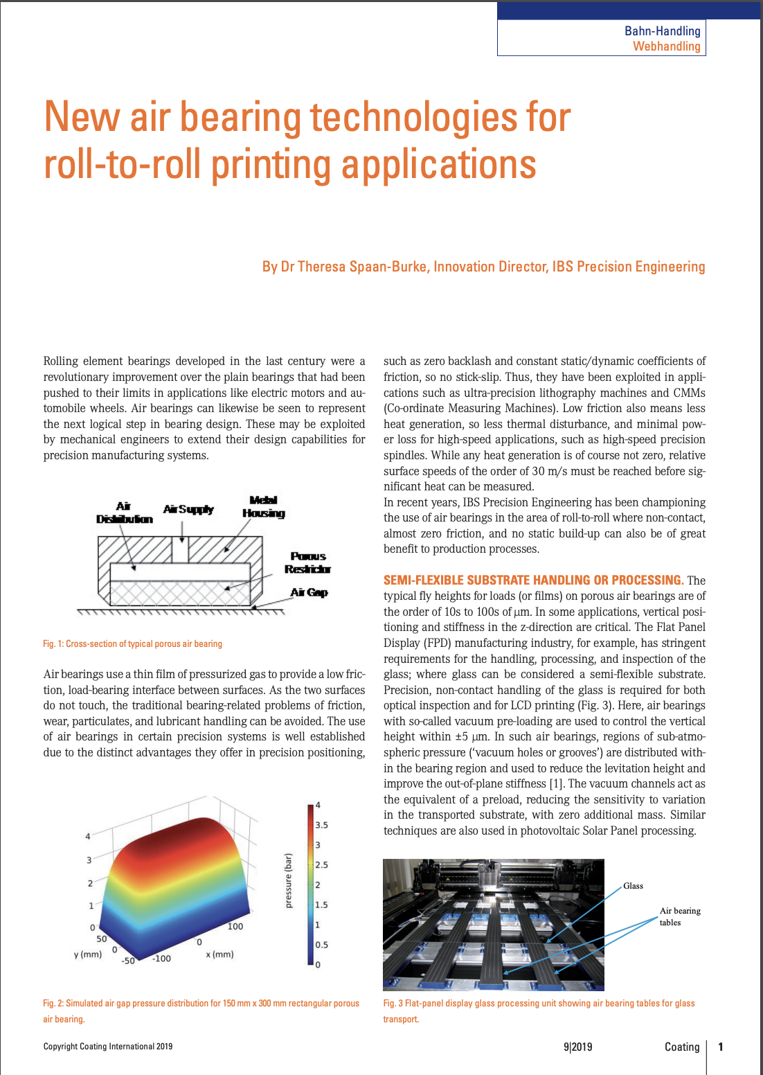 Click to view full IBS report (shown on right) In any industry where flexible materials are manufactured to a precise standard, the measurement of flatness and defects is paramount. Because Air Turns convey material on an adjustable film of air, this opens the door to the use of nanoscale interferometry techniques in order to measure flatness and web stability in real-time, as well as being able to adjust your Air Turns system accordingly.Independent testing via IBS Precision Engineering utilized ARINNA (areal interferometry for nanoscale surfaces) to conduct a test of web stabilization in a polyethylene terephthalate film (PET) coated substrate—both with and without—an air table. Without an air table and traveling at 5m/min, the web height varied by upwards of 100µm, whereas the air table produced a maximum variation of only 6µm.Interferometry measurements like these are only possible when an air gap or similar environs exists on both sides of the material, and thus, the Air Turn provides you with the unique capability to measure nanoscale defects throughout the manufacturing process rather than after the fact. To learn more, download our roll-to-roll processing eBook here.