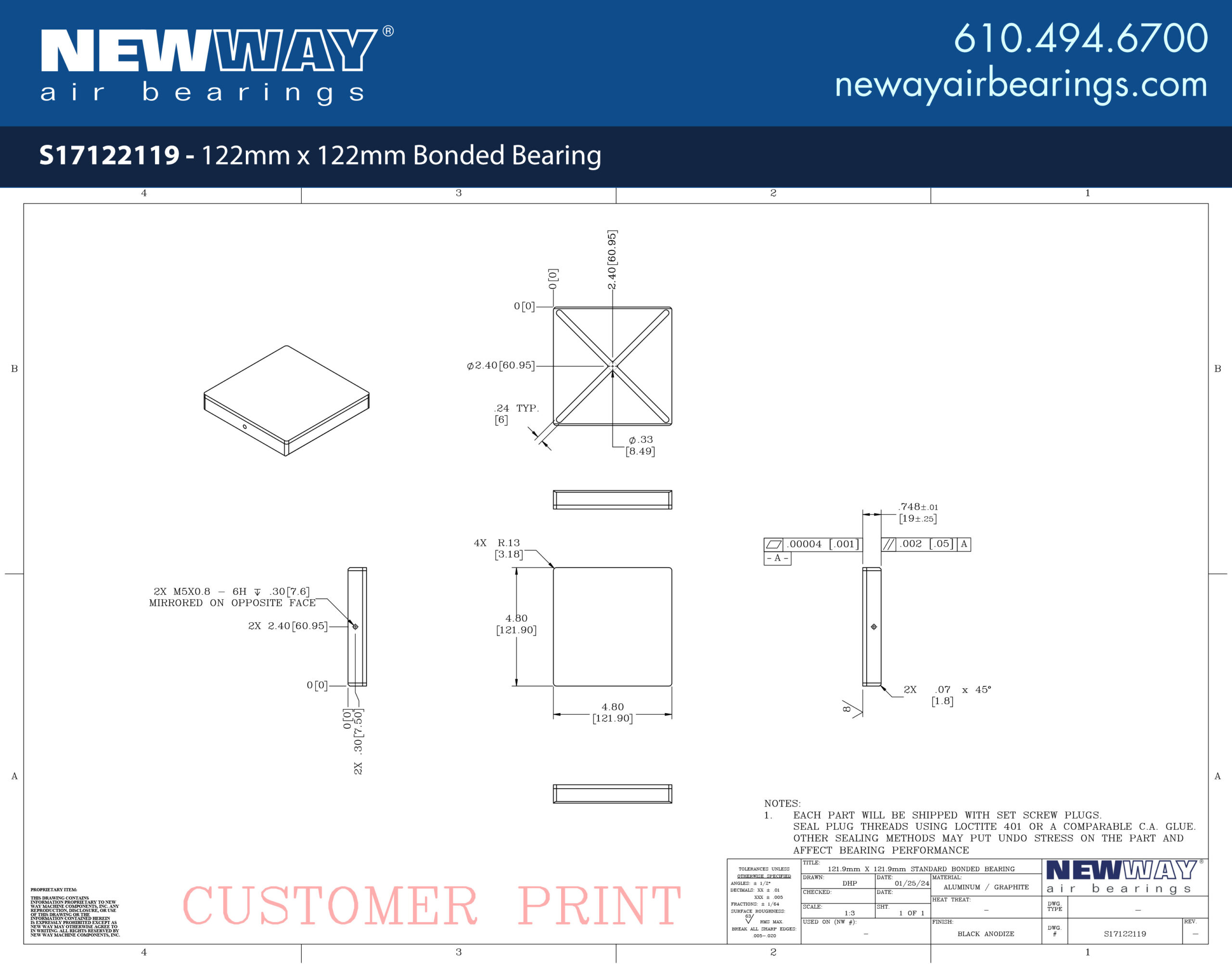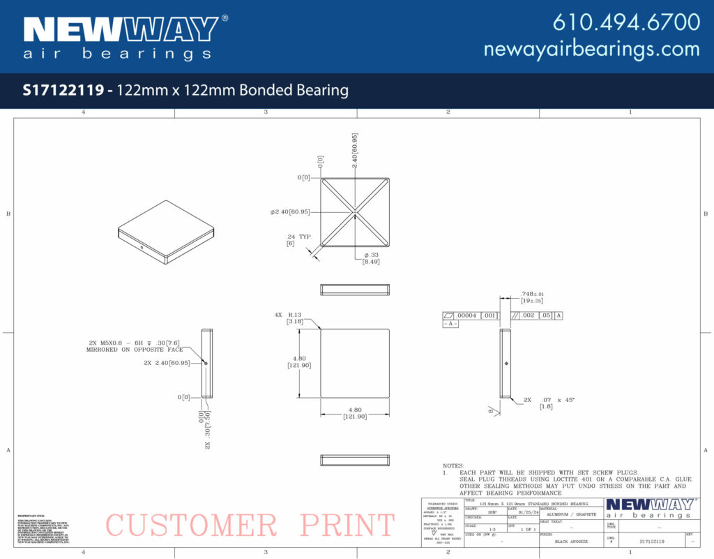 New Way’s 122mm x 122mm Bonded Bearing offers a solution for space-constrained linear applications. Bonded bearings are a low-profile version of our flat rectangular bearings as well as a critical component of our popular Linear Slides. Sold as a standalone component, bonded bearings are able to be positioned accurately through the use of vacuum replication prior to bonding the bearing into place.