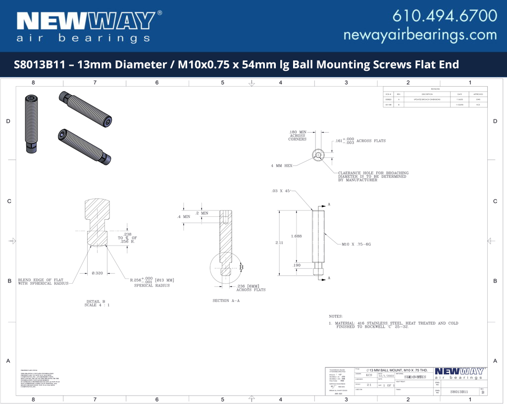 13mm Diameter / M10x0.75 x 54mm lg Ball Mounting Screws Flat End