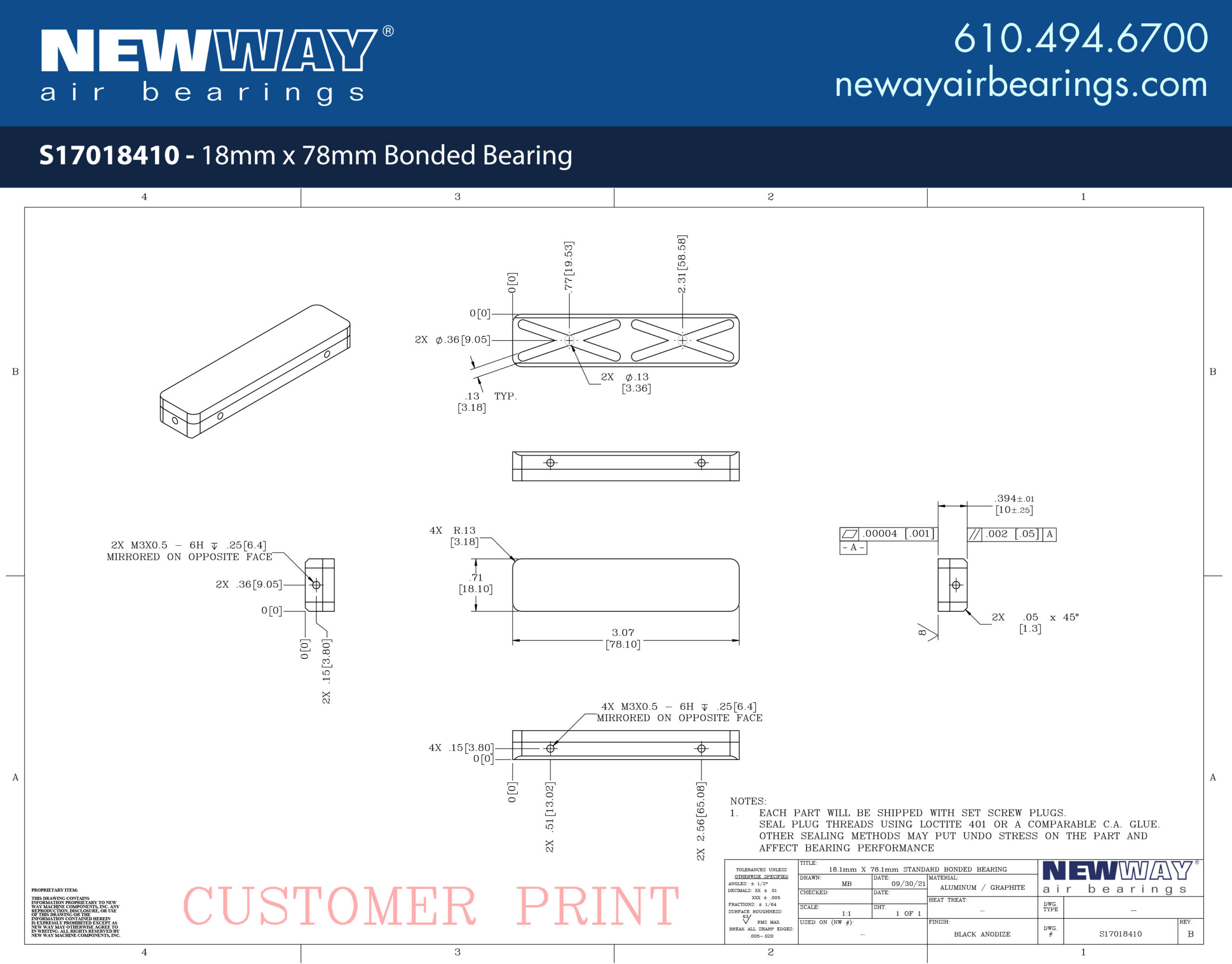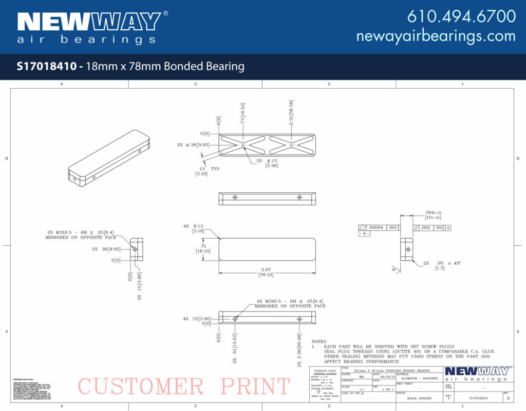 New Way’s 18mm x 78mm Bonded Bearing offers a solution for space-constrained linear applications. Bonded bearings are a low-profile version of our flat rectangular bearings as well as a critical component of our popular Linear Slides. Sold as a standalone component, bonded bearings are able to be positioned accurately through the use of vacuum replication prior to bonding the bearing into place. The large length size relative to the width is accommodated through an additional set of air grooves to ensure even distribution of air for optimum performance.