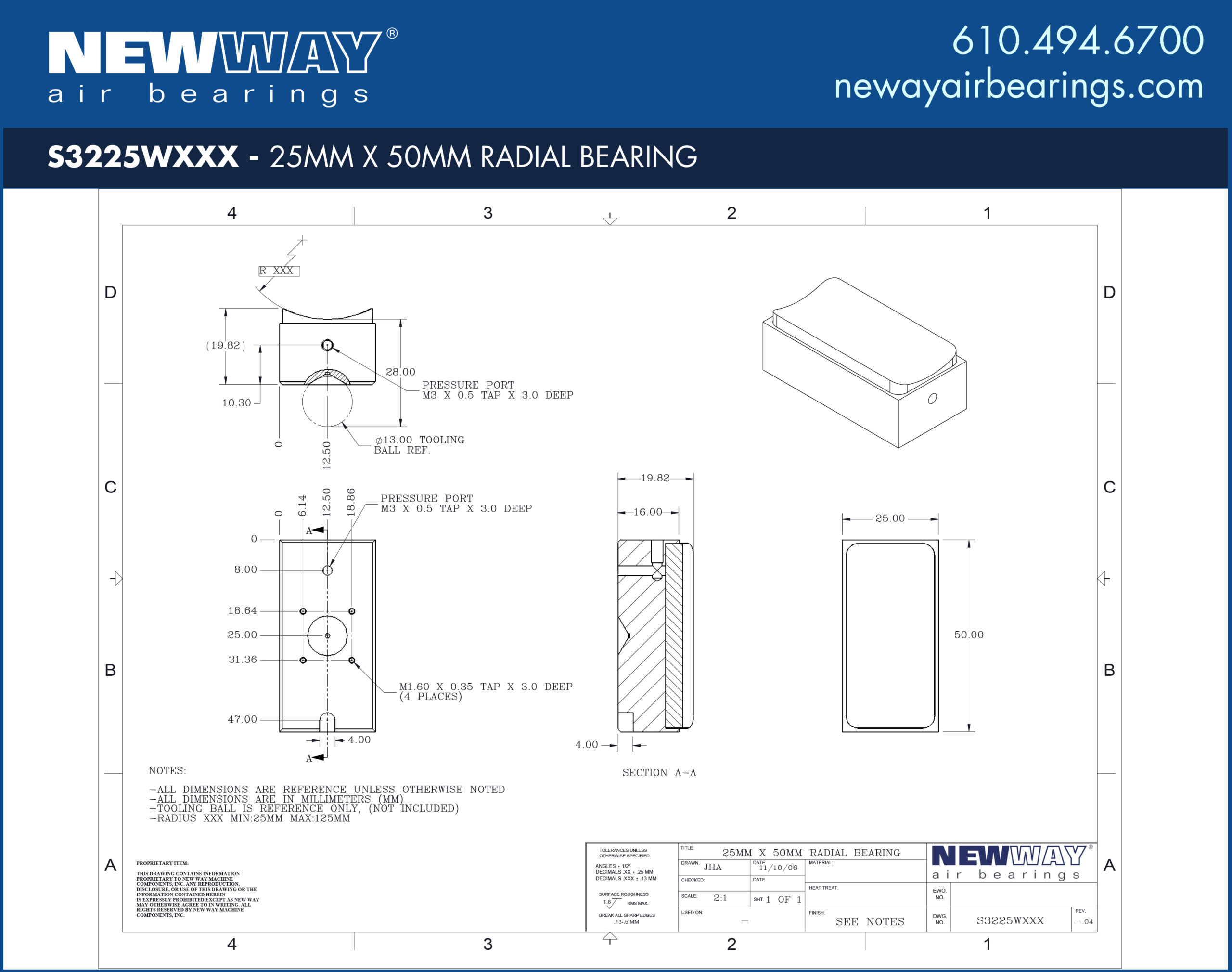 Mounting Details for 25mm x 50mm Radial Air Bearings Concave W Profile with Flat End Ball Mounting Screw