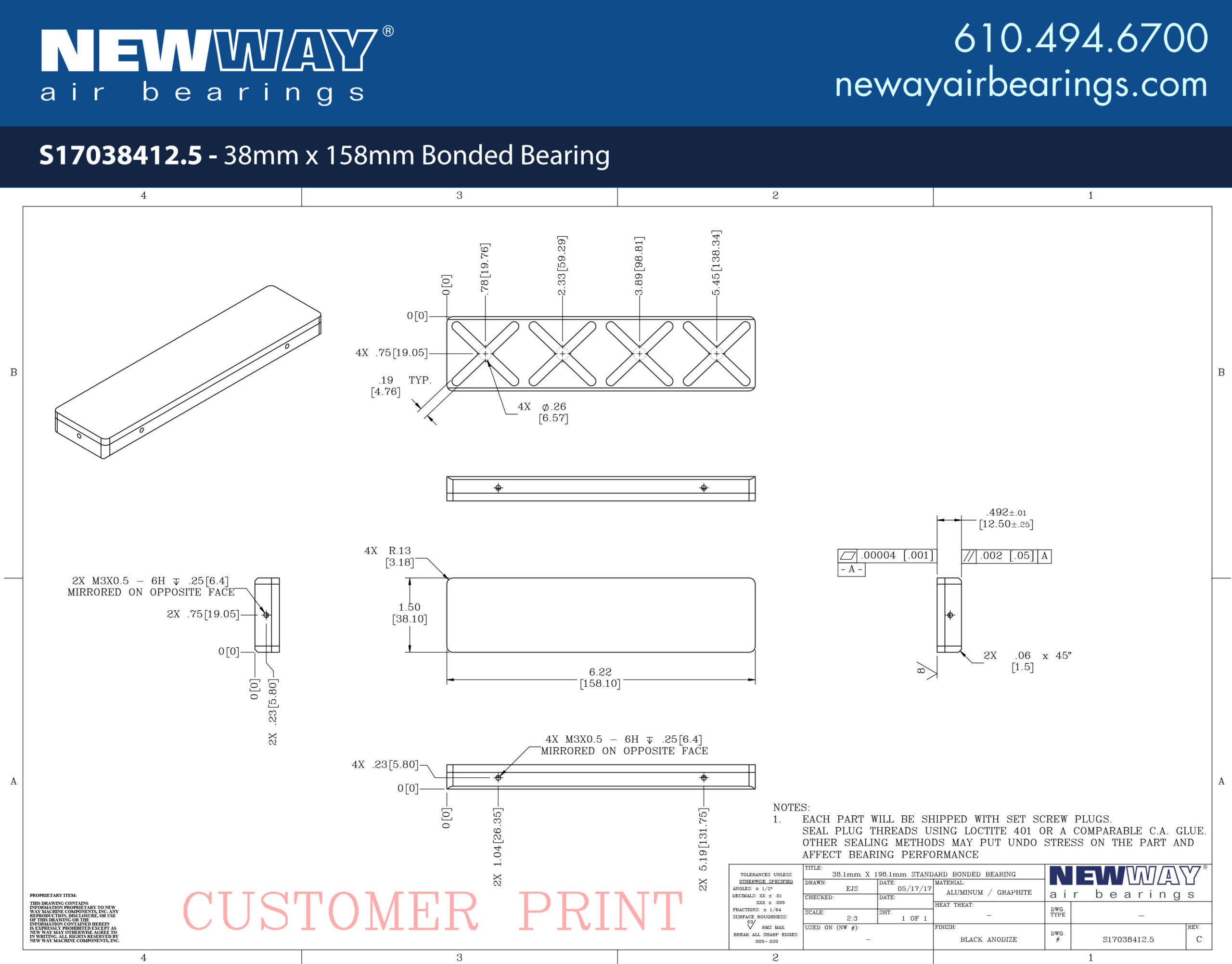 New Way’s 38mm x 158mm Bonded Bearing offers a solution for space-constrained linear applications. Bonded bearings are a low-profile version of our flat rectangular bearings as well as a critical component of our popular Linear Slides. Sold as a standalone component, bonded bearings are able to be positioned accurately through the use of vacuum replication prior to bonding the bearing into place. The large length size relative to the width is accommodated through additional sets of air grooves to ensure even distribution of air for optimum performance.