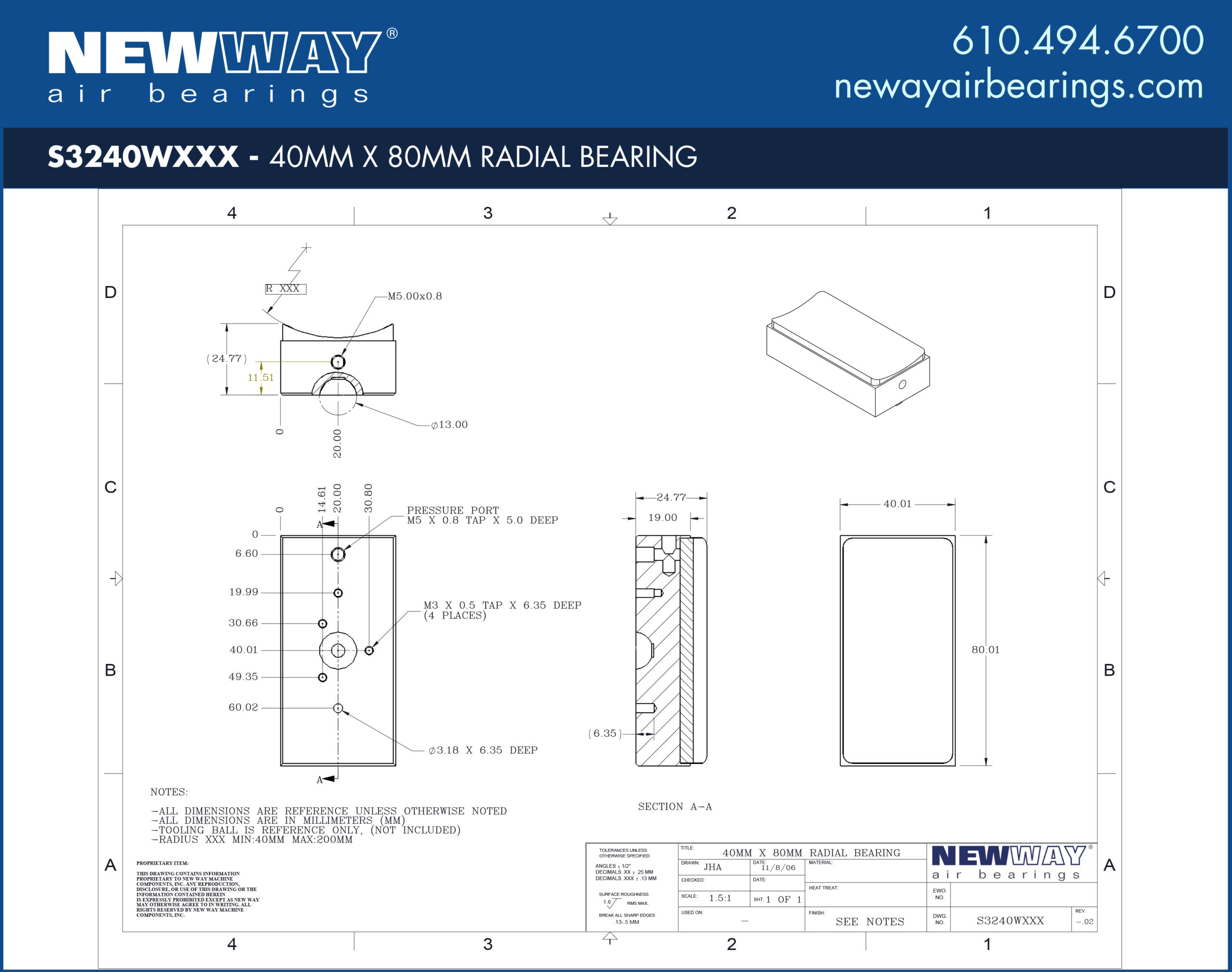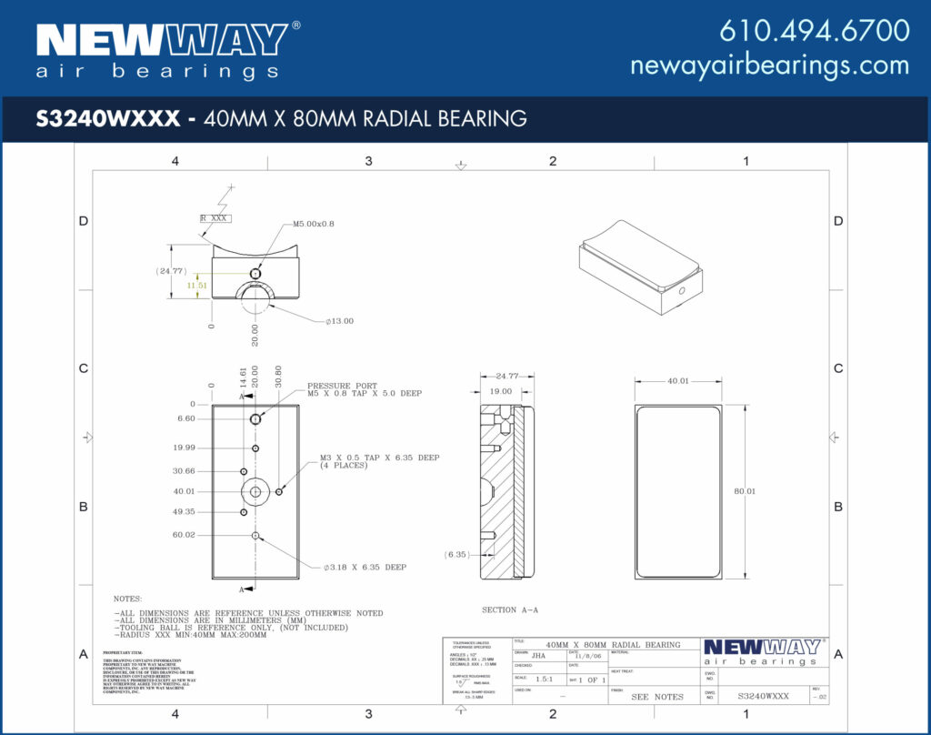 Mounting Details for 40mm x 80mm Radial Air Bearings Concave W Profile with Stainless Steel Ball
