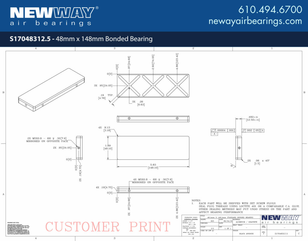 New Way’s 48mm x 148mm Bonded Bearing offers a solution for space-constrained linear applications. Bonded bearings are a low-profile version of our flat rectangular bearings as well as a critical component of our popular Linear Slides. Sold as a standalone component, bonded bearings are able to be positioned accurately through the use of vacuum replication prior to bonding the bearing into place. The large length size relative to the width is accommodated through additional sets of air grooves to ensure even distribution of air for optimum performance.