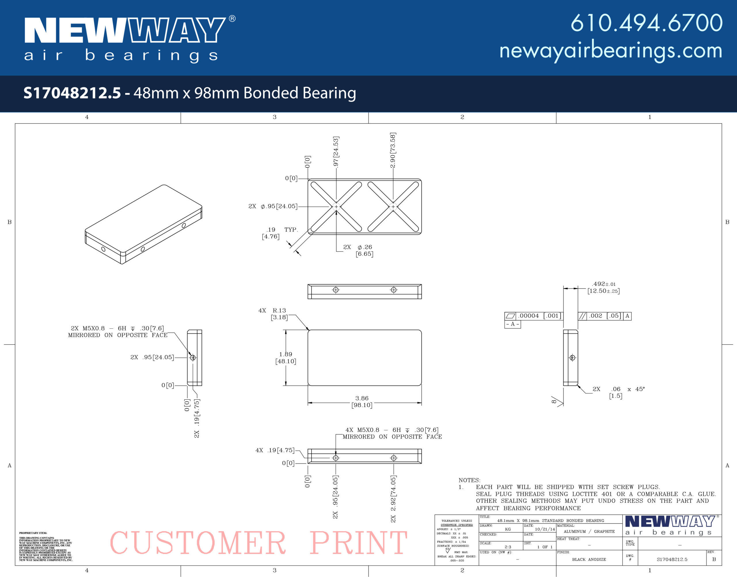 New Way’s 48mm x 98mm Bonded Bearing offers a solution for space-constrained linear applications. Bonded bearings are a low-profile version of our flat rectangular bearings as well as a critical component of our popular Linear Slides. Sold as a standalone component, bonded bearings are able to be positioned accurately through the use of vacuum replication prior to bonding the bearing into place. The large length size relative to the width is accommodated through an additional set of air grooves to ensure even distribution of air for optimum performance.