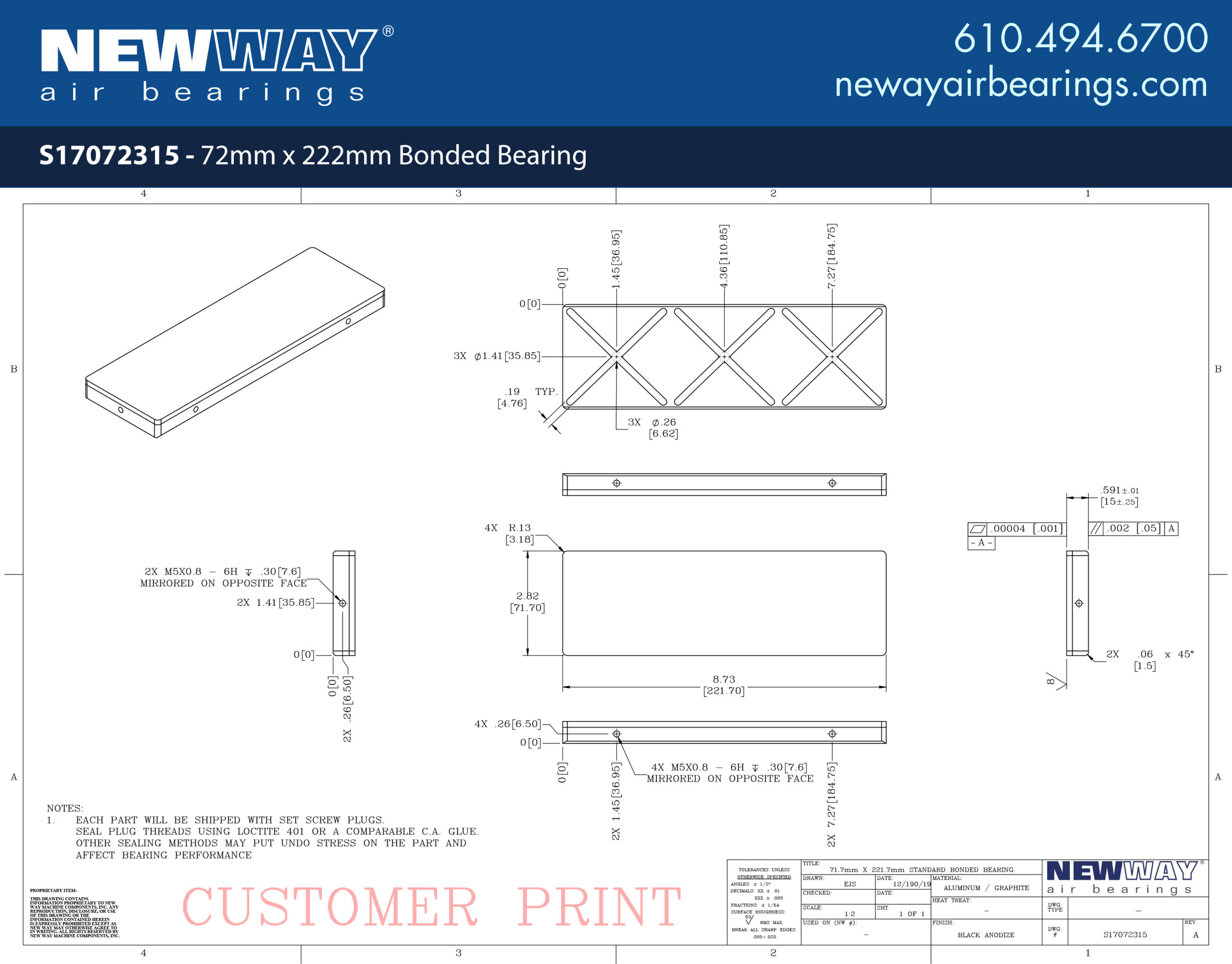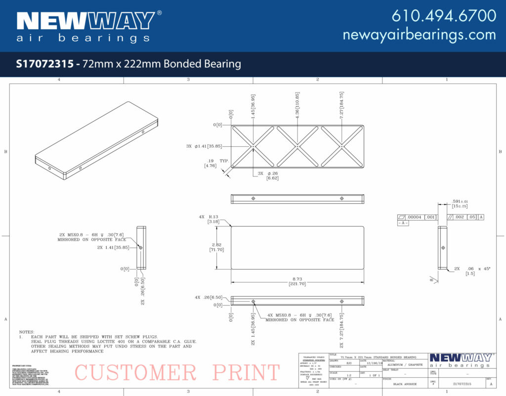 New Way’s 72mm x 222mm Bonded Bearing offers a solution for space-constrained linear applications. Bonded bearings are a low-profile version of our flat rectangular bearings as well as a critical component of our popular Linear Slides. Sold as a standalone component, bonded bearings are able to be positioned accurately through the use of vacuum replication prior to bonding the bearing into place. The large length size relative to the width is accommodated through additional sets of air grooves to ensure even distribution of air for optimum performance.