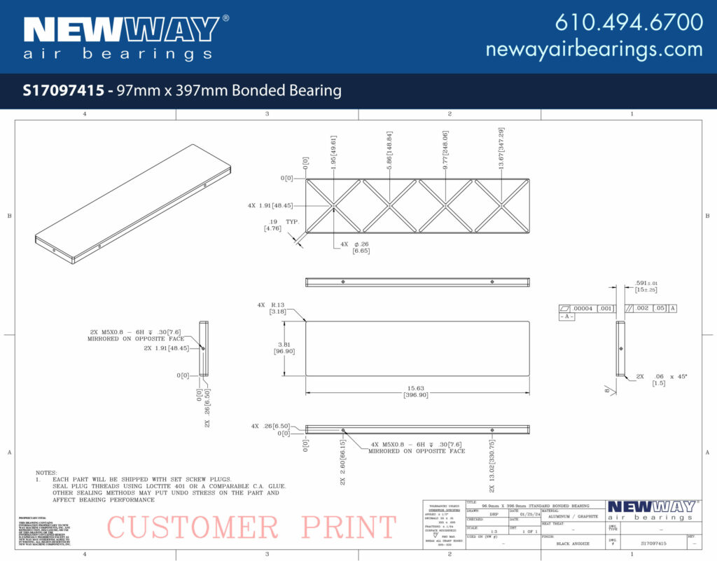 New Way’s 97mm x 397mm Bonded Bearing offers a solution for space-constrained linear applications. Bonded bearings are a low-profile version of our flat rectangular bearings as well as a critical component of our popular Linear Slides. Sold as a standalone component, bonded bearings are able to be positioned accurately through the use of vacuum replication prior to bonding the bearing into place. The large length size relative to the width is accommodated through additional sets of air grooves to ensure even distribution of air for optimum performance.