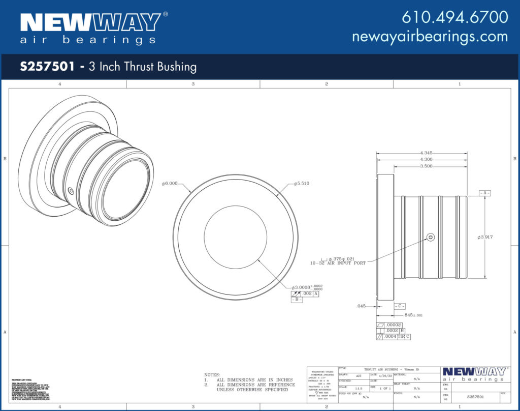S257501 Thrust Bushings makes air bearing technology readily available to engineers who require radial motion with axial constraint. The S257501 runs on a standard imperial precision machined steel shaft.