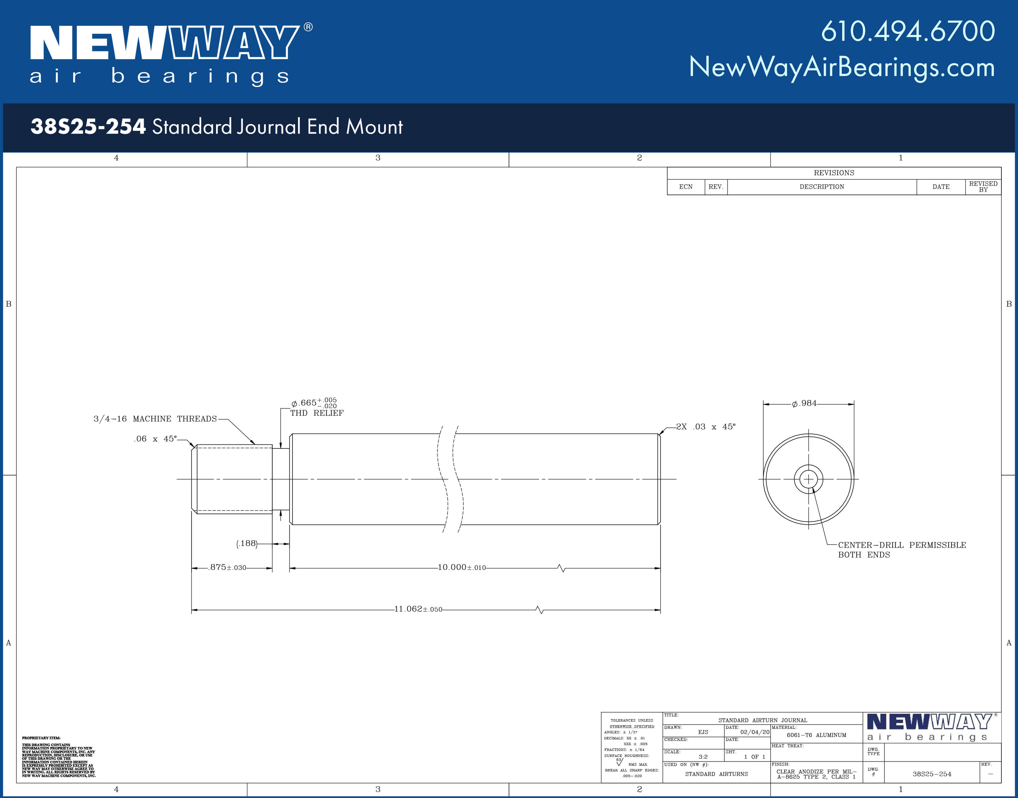 New Way offers a standard mounting journal for all of our standard Air Turns. While the standard journal comes at a length of 10 inches (254 mm), it can be cut down to size per customer request (P/N 38S25-XXX). The journal is made of aluminum, and is clear anodized.