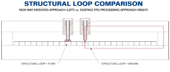 “The second significant advantage of our new patent is the reduction in size of the overall structural loop,” Devitt continued. “Many contemporary FPD processing lines still feature a multi-ton granite base, a giant gantry with two large granite columns, a huge stage mechanism, and the processing equipment or inspection cameras themselves. This structural loop can be 10 meters or longer.”