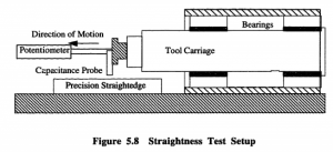 For straightness testing, the configuration shown below in figure six was utilized. A potentiometer with constant voltage source was used to measure axial position, while a capacitance probe measured lateral displacement.